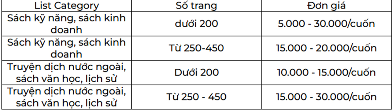 Bảng giá thanh lý sách cũ sẽ phụ thuộc vào nhiều yếu tố như: thể loại, tình trạng sách, độ hiếm,… Những đầu sách được thanh lý, thu mua với giá cao thường là những đầu sách trước năm 1975, sách kỹ năng, sách kiến ​​thức, truyện dịch nước ngoài,… Với những cuốn sách này, Bảo Khang sẽ báo giá theo từng cuốn.